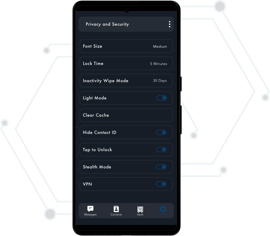 VaultChat offers fully customizable security settings to meet your privacy needs. Set lock times and strong passwords, including a duress password that triggers a data wipe. Hide your ID, enable tap-to-unlock messages, activate stealth mode, and access a built-in VPN for anonymous, secure communication, all tailored to your preferences.
